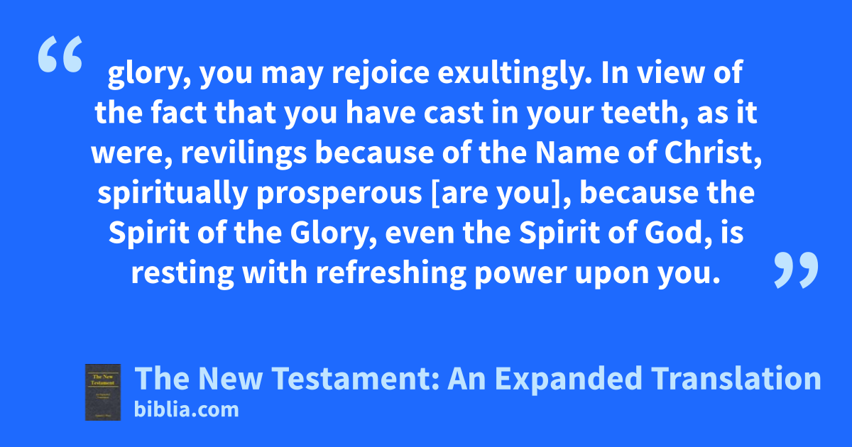 glory, you may rejoice exultingly. In view of the fact that you have cast in your teeth, as it were, revilings because of the Name of Christ, spiritually prosperous [are you], because the Spirit of the Glory, even the Spirit of God, is resting with refreshing power upon you.