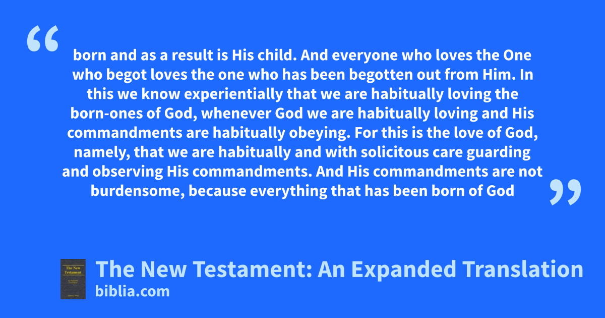 born and as a result is His child. And everyone who loves the One who begot loves the one who has been begotten out from Him. In this we know experientially that we are habitually loving the born-ones of God, whenever God we are habitually loving and His commandments are habitually obeying. For this is the love of God, namely, that we are habitually and with solicitous care guarding and observing His commandments. And His commandments are not burdensome, because everything that has been born of God
