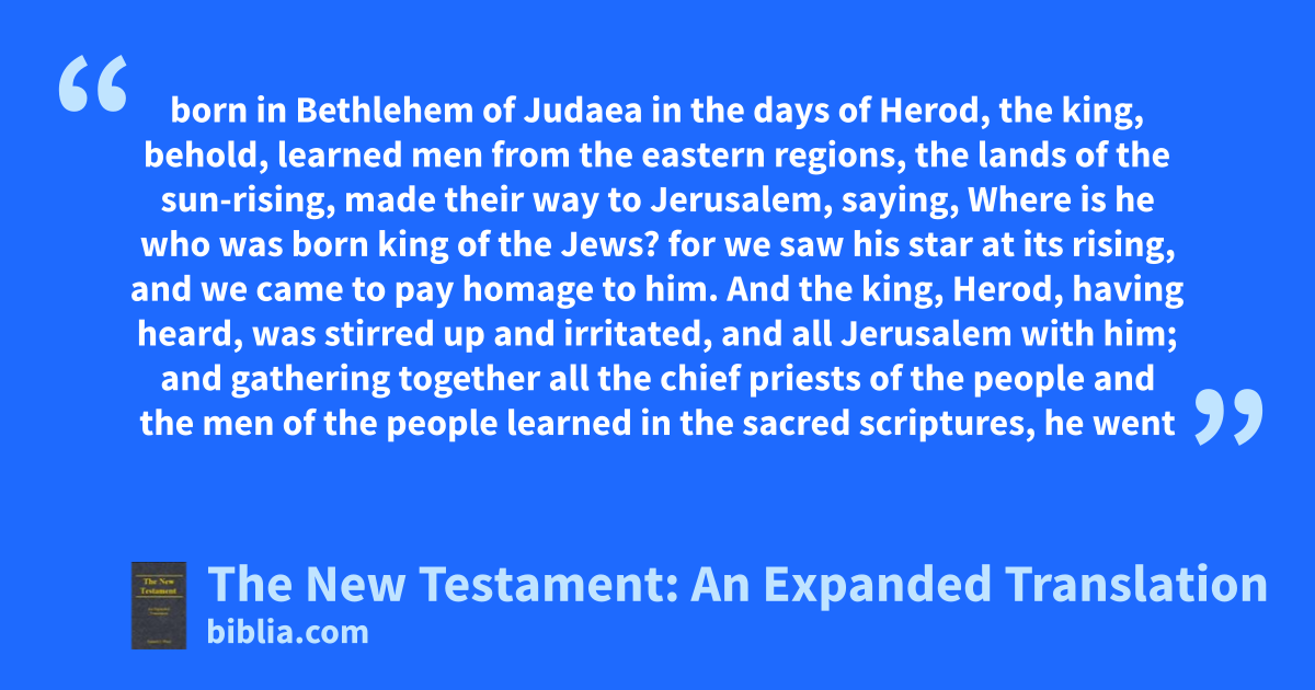 born in Bethlehem of Judaea in the days of Herod, the king, behold, learned men from the eastern regions, the lands of the sun-rising, made their way to Jerusalem, saying, Where is he who was born king of the Jews? for we saw his star at its rising, and we came to pay homage to him. And the king, Herod, having heard, was stirred up and irritated, and all Jerusalem with him; and gathering together all the chief priests of the people and the men of the people learned in the sacred scriptures, he went