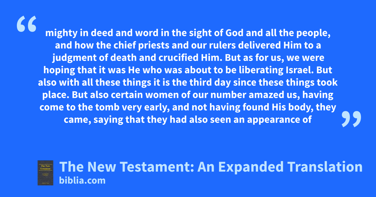 mighty in deed and word in the sight of God and all the people, and how the chief priests and our rulers delivered Him to a judgment of death and crucified Him. But as for us, we were hoping that it was He who was about to be liberating Israel. But also with all these things it is the third day since these things took place. But also certain women of our number amazed us, having come to the tomb very early, and not having found His body, they came, saying that they had also seen an appearance of