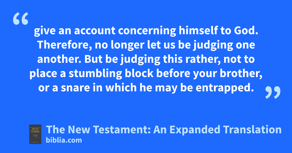 give an account concerning himself to God. Therefore, no longer let us be judging one another. But be judging this rather, not to place a stumbling block before your brother, or a snare in which he may be entrapped.
