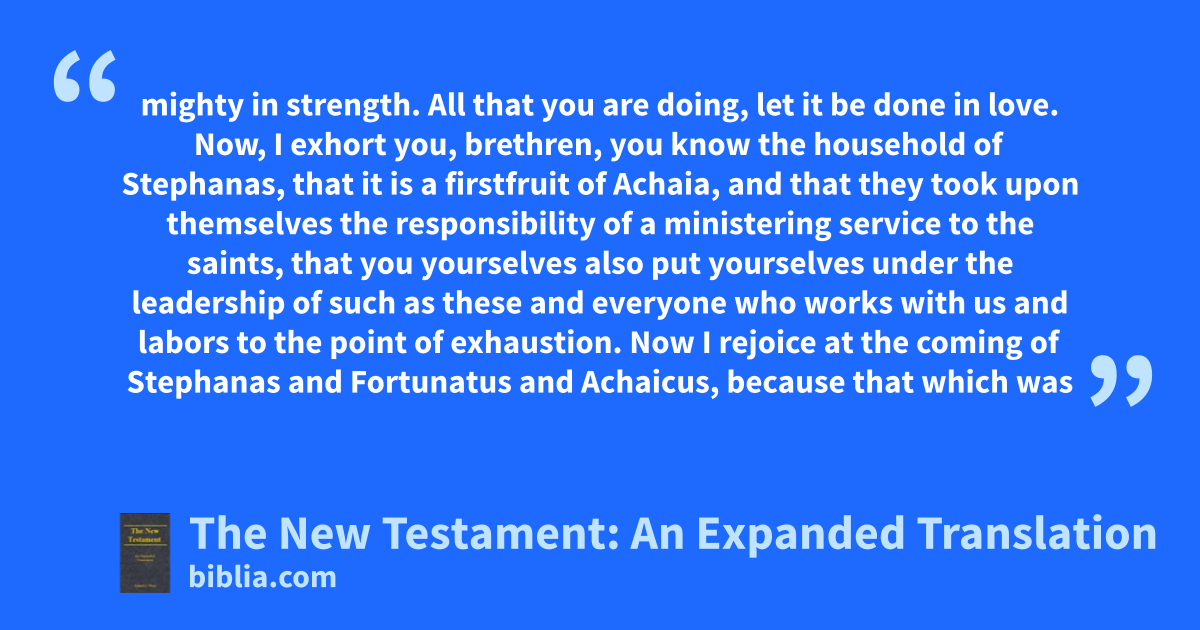 mighty in strength. All that you are doing, let it be done in love. Now, I exhort you, brethren, you know the household of Stephanas, that it is a firstfruit of Achaia, and that they took upon themselves the responsibility of a ministering service to the saints, that you yourselves also put yourselves under the leadership of such as these and everyone who works with us and labors to the point of exhaustion. Now I rejoice at the coming of Stephanas and Fortunatus and Achaicus, because that which was