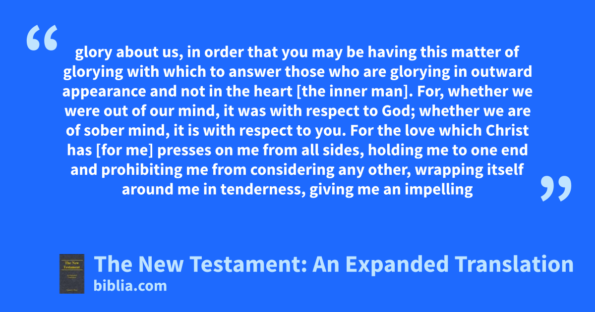glory about us, in order that you may be having this matter of glorying with which to answer those who are glorying in outward appearance and not in the heart [the inner man]. For, whether we were out of our mind, it was with respect to God; whether we are of sober mind, it is with respect to you. For the love which Christ has [for me] presses on me from all sides, holding me to one end and prohibiting me from considering any other, wrapping itself around me in tenderness, giving me an impelling