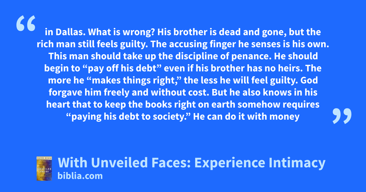 in Dallas. What is wrong? His brother is dead and gone, but the rich man still feels guilty. The accusing finger he senses is his own. This man should take up the discipline of penance. He should begin to “pay off his debt” even if his brother has no heirs. The more he “makes things right,” the less he will feel guilty. God forgave him freely and without cost. But he also knows in his heart that to keep the books right on earth somehow requires “paying his debt to society.” He can do it with money