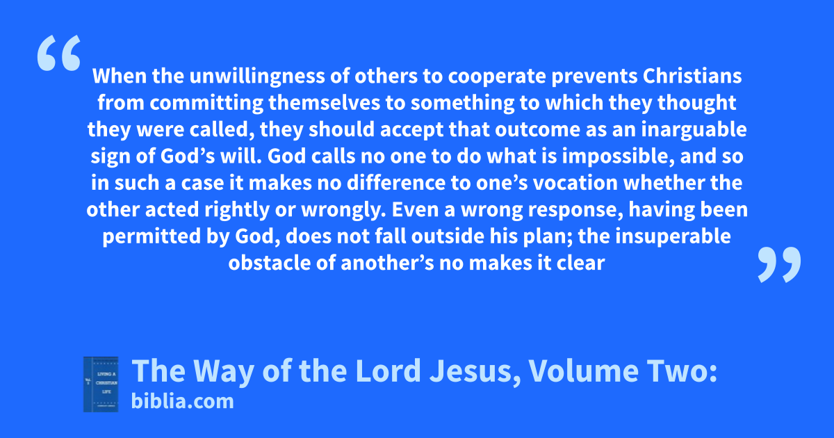 When the unwillingness of others to cooperate prevents Christians from committing themselves to something to which they thought they were called, they should accept that outcome as an inarguable sign of God’s will. God calls no one to do what is impossible, and so in such a case it makes no difference to one’s vocation whether the other acted rightly or wrongly. Even a wrong response, having been permitted by God, does not fall outside his plan; the insuperable obstacle of another’s no makes it clear