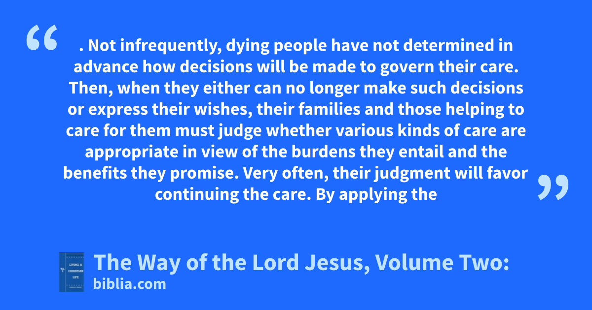 . Not infrequently, dying people have not determined in advance how decisions will be made to govern their care. Then, when they either can no longer make such decisions or express their wishes, their families and those helping to care for them must judge whether various kinds of care are appropriate in view of the burdens they entail and the benefits they promise. Very often, their judgment will favor continuing the care. By applying the