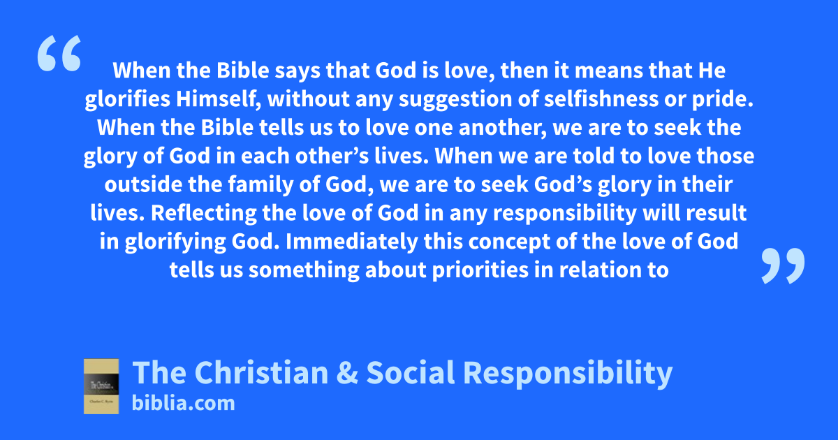 When the Bible says that God is love, then it means that He glorifies Himself, without any suggestion of selfishness or pride. When the Bible tells us to love one another, we are to seek the glory of God in each other’s lives. When we are told to love those outside the family of God, we are to seek God’s glory in their lives. Reflecting the love of God in any responsibility will result in glorifying God. Immediately this concept of the love of God tells us something about priorities in relation to
