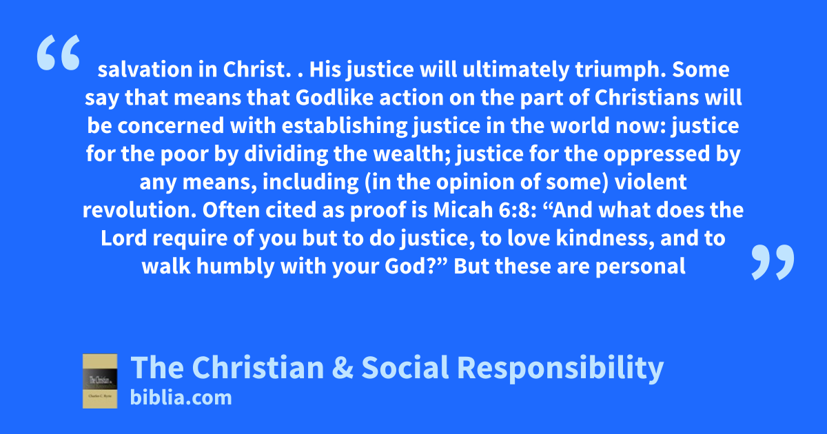 salvation in Christ. . His justice will ultimately triumph. Some say that means that Godlike action on the part of Christians will be concerned with establishing justice in the world now: justice for the poor by dividing the wealth; justice for the oppressed by any means, including (in the opinion of some) violent revolution. Often cited as proof is Micah 6:8: “And what does the Lord require of you but to do justice, to love kindness, and to walk humbly with your God?” But these are personal