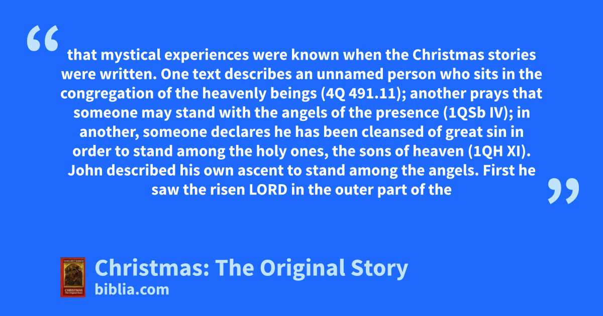 that mystical experiences were known when the Christmas stories were written. One text describes an unnamed person who sits in the congregation of the heavenly beings (4Q 491.11); another prays that someone may stand with the angels of the presence (1QSb IV); in another, someone declares he has been cleansed of great sin in order to stand among the holy ones, the sons of heaven (1QH XI). John described his own ascent to stand among the angels. First he saw the risen LORD in the outer part of the