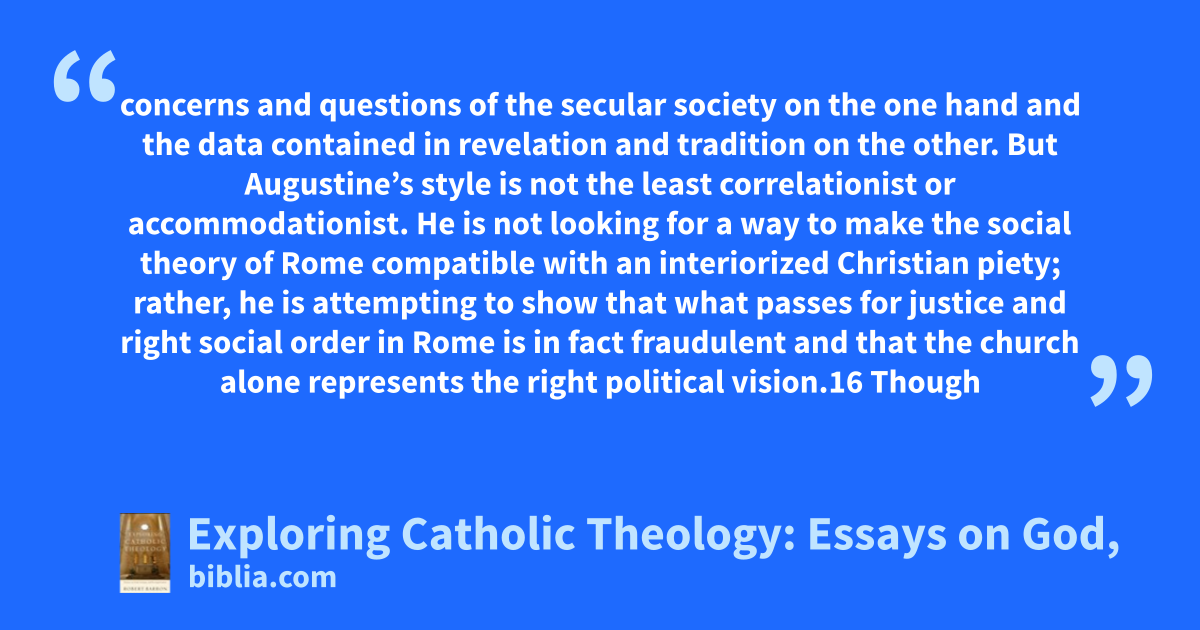 concerns and questions of the secular society on the one hand and the data contained in revelation and tradition on the other. But Augustine’s style is not the least correlationist or accommodationist. He is not looking for a way to make the social theory of Rome compatible with an interiorized Christian piety; rather, he is attempting to show that what passes for justice and right social order in Rome is in fact fraudulent and that the church alone represents the right political vision.16 Though