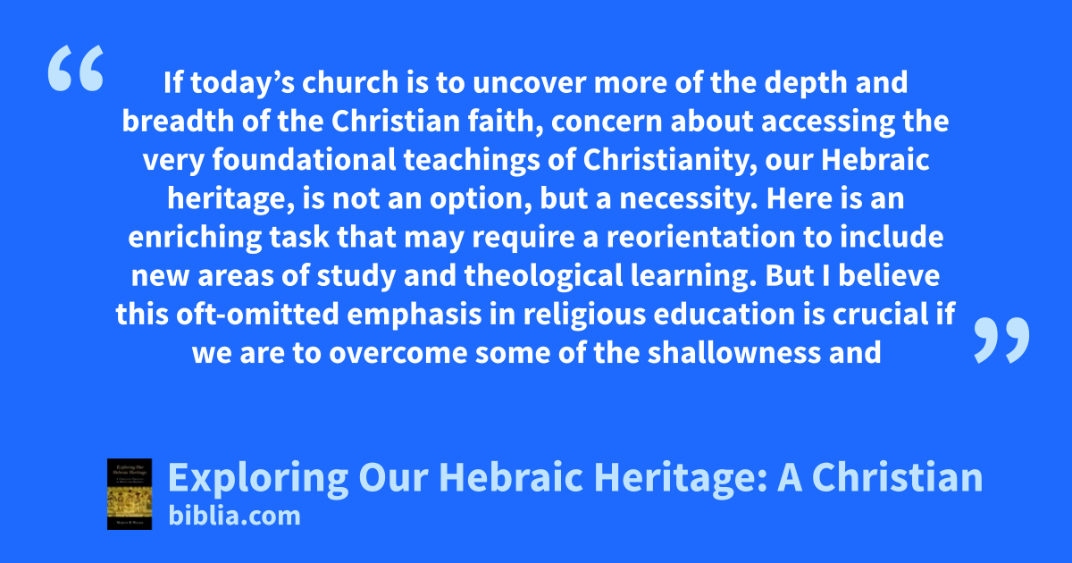 If today’s church is to uncover more of the depth and breadth of the Christian faith, concern about accessing the very foundational teachings of Christianity, our Hebraic heritage, is not an option, but a necessity. Here is an enriching task that may require a reorientation to include new areas of study and theological learning. But I believe this oft-omitted emphasis in religious education is crucial if we are to overcome some of the shallowness and