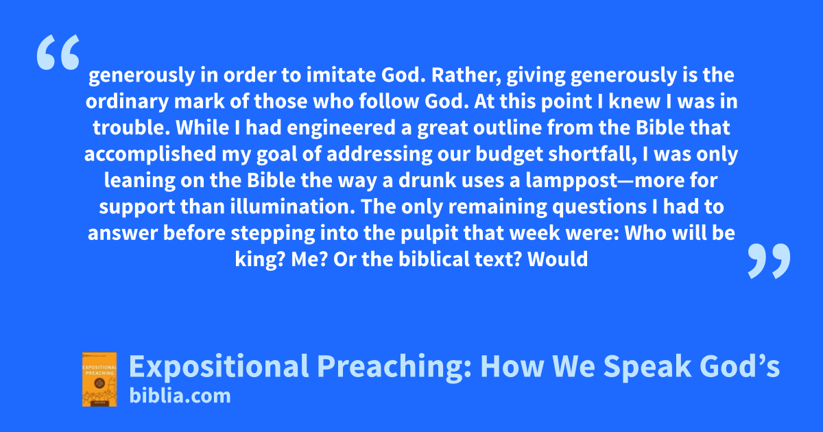 generously in order to imitate God. Rather, giving generously is the ordinary mark of those who follow God. At this point I knew I was in trouble. While I had engineered a great outline from the Bible that accomplished my goal of addressing our budget shortfall, I was only leaning on the Bible the way a drunk uses a lamppost—more for support than illumination. The only remaining questions I had to answer before stepping into the pulpit that week were: Who will be king? Me? Or the biblical text? Would