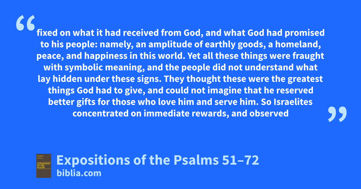 fixed on what it had received from God, and what God had promised to his people: namely, an amplitude of earthly goods, a homeland, peace, and happiness in this world. Yet all these things were fraught with symbolic meaning, and the people did not understand what lay hidden under these signs. They thought these were the greatest things God had to give, and could not imagine that he reserved better gifts for those who love him and serve him. So Israelites concentrated on immediate rewards, and observed
