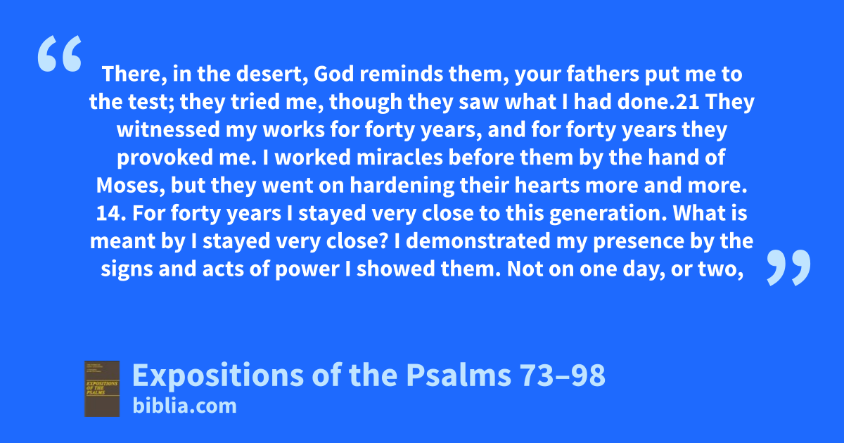 There, in the desert, God reminds them, your fathers put me to the test; they tried me, though they saw what I had done.21 They witnessed my works for forty years, and for forty years they provoked me. I worked miracles before them by the hand of Moses, but they went on hardening their hearts more and more. 14. For forty years I stayed very close to this generation. What is meant by I stayed very close? I demonstrated my presence by the signs and acts of power I showed them. Not on one day, or two,