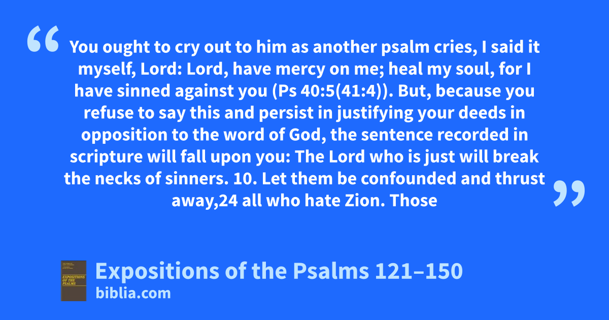 You ought to cry out to him as another psalm cries, I said it myself, Lord: Lord, have mercy on me; heal my soul, for I have sinned against you (Ps 40:5(41:4)). But, because you refuse to say this and persist in justifying your deeds in opposition to the word of God, the sentence recorded in scripture will fall upon you: The Lord who is just will break the necks of sinners. 10. Let them be confounded and thrust away,24 all who hate Zion. Those