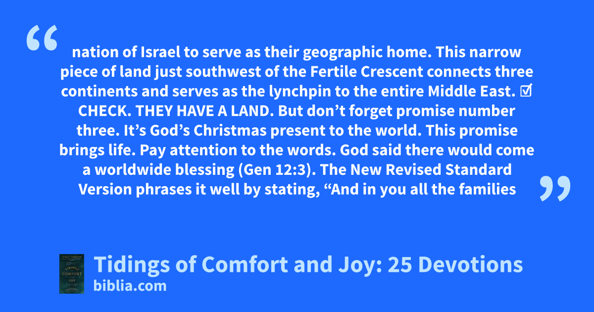 nation of Israel to serve as their geographic home. This narrow piece of land just southwest of the Fertile Crescent connects three continents and serves as the lynchpin to the entire Middle East. ☑ CHECK. THEY HAVE A LAND. But don’t forget promise number three. It’s God’s Christmas present to the world. This promise brings life. Pay attention to the words. God said there would come a worldwide blessing (Gen 12:3). The New Revised Standard Version phrases it well by stating, “And in you all the families