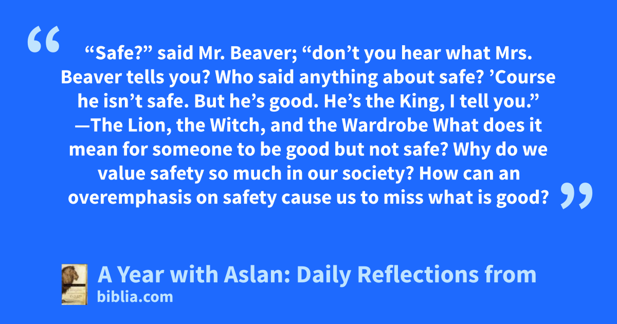 “Safe?” said Mr. Beaver; “don’t you hear what Mrs. Beaver tells you? Who said anything about safe? ’Course he isn’t safe. But he’s good. He’s the King, I tell you.” —The Lion, the Witch, and the Wardrobe What does it mean for someone to be good but not safe? Why do we value safety so much in our society? How can an overemphasis on safety cause us to miss what is good?