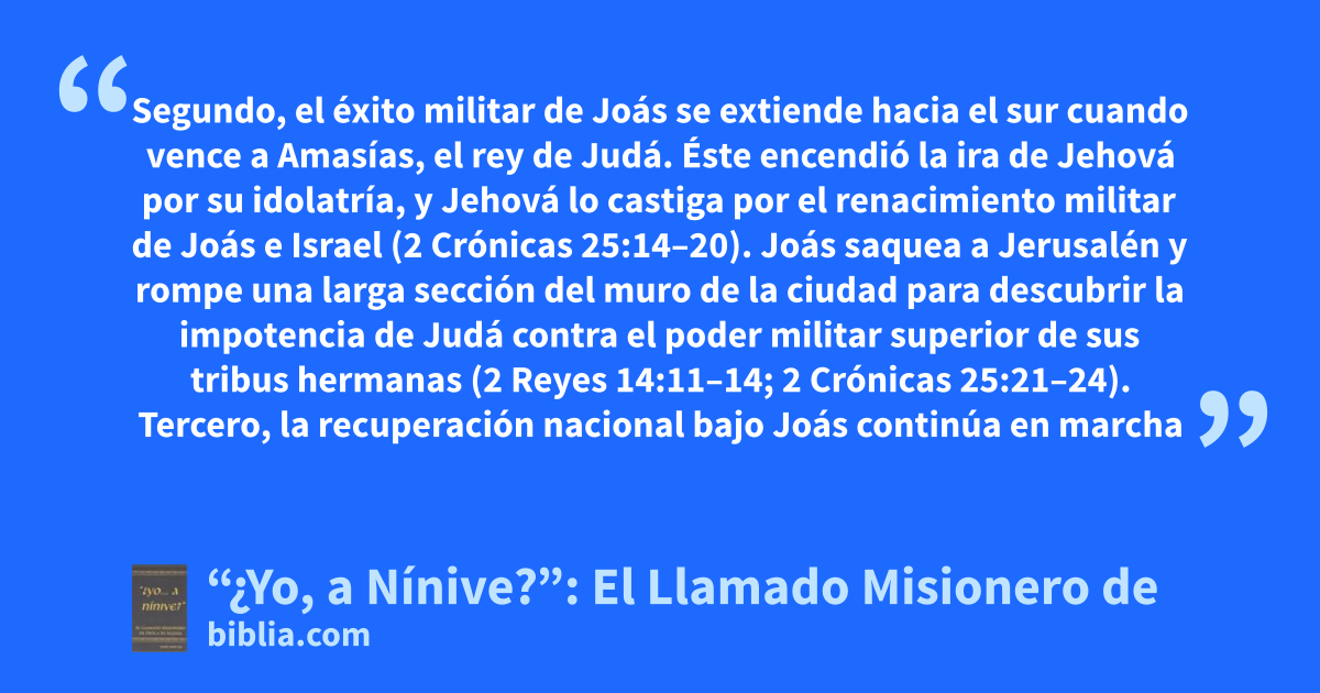 Segundo, el éxito militar de Joás se extiende hacia el sur cuando vence a Amasías, el rey de Judá. Éste encendió la ira de Jehová por su idolatría, y Jehová lo castiga por el renacimiento militar de Joás e Israel (2 Crónicas 25:14–20). Joás saquea a Jerusalén y rompe una larga sección del muro de la ciudad para descubrir la impotencia de Judá contra el poder militar superior de sus tribus hermanas (2 Reyes 14:11–14; 2 Crónicas 25:21–24). Tercero, la recuperación nacional bajo Joás continúa en marcha