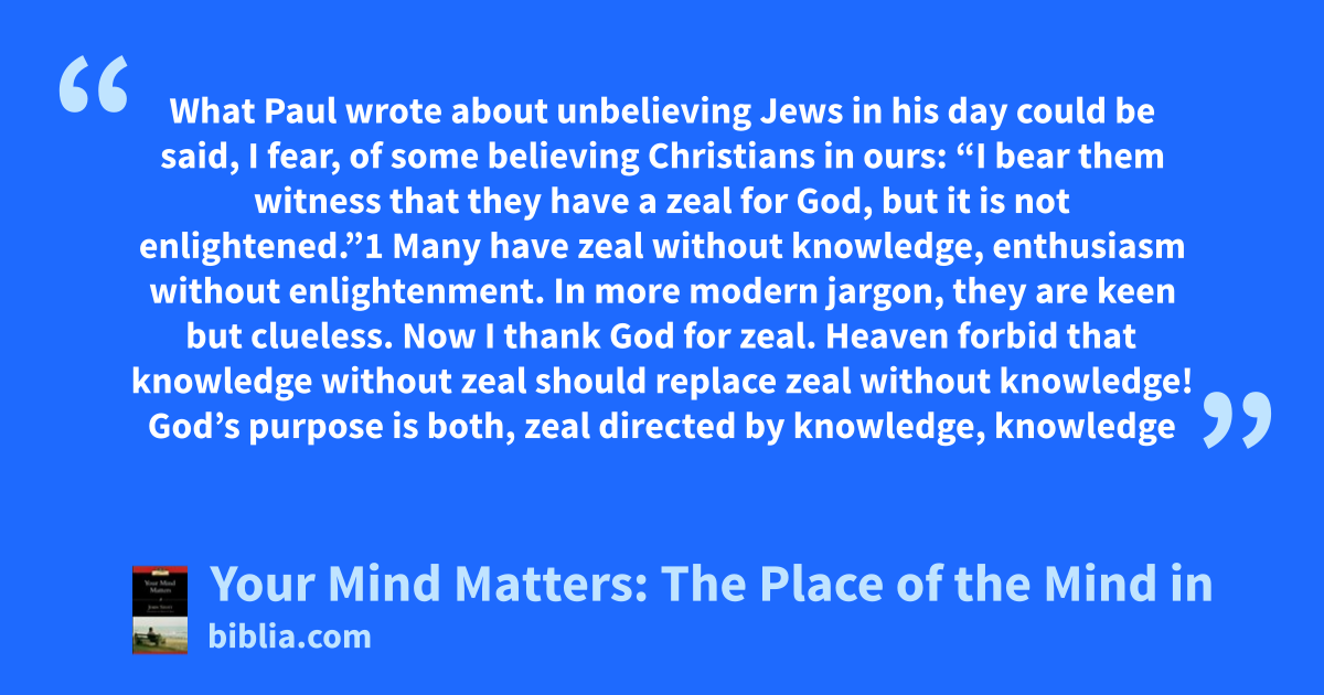 What Paul wrote about unbelieving Jews in his day could be said, I fear, of some believing Christians in ours: “I bear them witness that they have a zeal for God, but it is not enlightened.”1 Many have zeal without knowledge, enthusiasm without enlightenment. In more modern jargon, they are keen but clueless. Now I thank God for zeal. Heaven forbid that knowledge without zeal should replace zeal without knowledge! God’s purpose is both, zeal directed by knowledge, knowledge