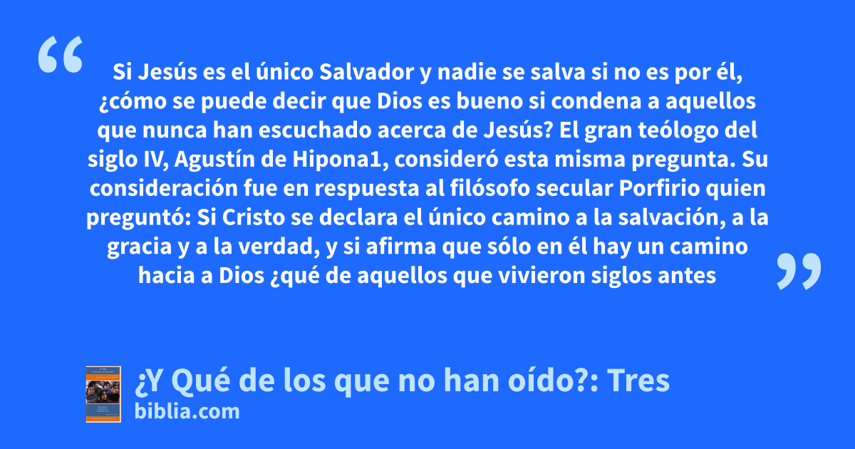 Si Jesús es el único Salvador y nadie se salva si no es por él, ¿cómo se puede decir que Dios es bueno si condena a aquellos que nunca han escuchado acerca de Jesús? El gran teólogo del siglo IV, Agustín de Hipona1, consideró esta misma pregunta. Su consideración fue en respuesta al filósofo secular Porfirio quien preguntó: Si Cristo se declara el único camino a la salvación, a la gracia y a la verdad, y si afirma que sólo en él hay un camino hacia a Dios ¿qué de aquellos que vivieron siglos antes