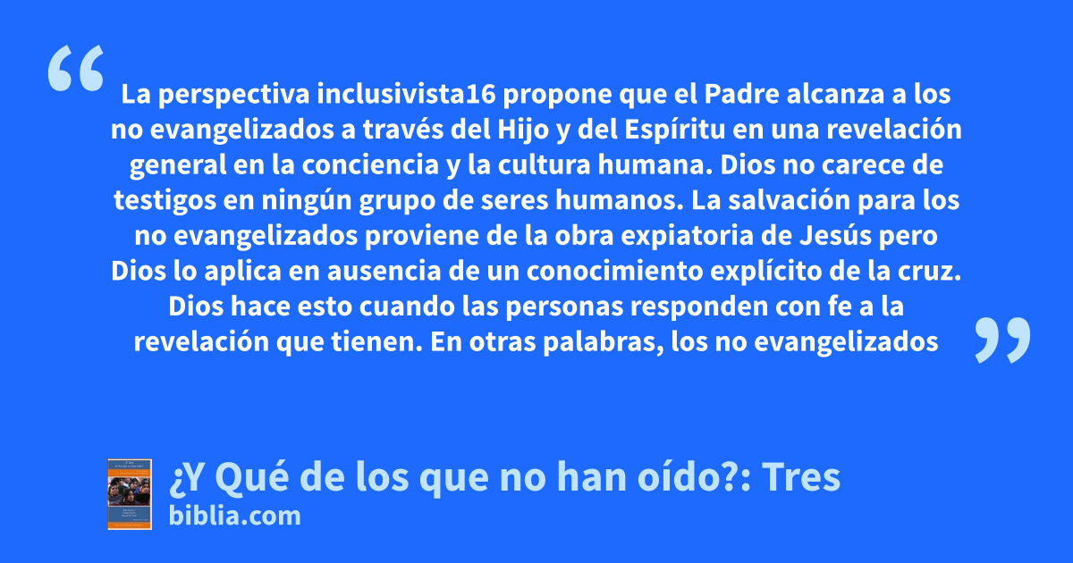 La perspectiva inclusivista16 propone que el Padre alcanza a los no evangelizados a través del Hijo y del Espíritu en una revelación general en la conciencia y la cultura humana. Dios no carece de testigos en ningún grupo de seres humanos. La salvación para los no evangelizados proviene de la obra expiatoria de Jesús pero Dios lo aplica en ausencia de un conocimiento explícito de la cruz. Dios hace esto cuando las personas responden con fe a la revelación que tienen. En otras palabras, los no evangelizados
