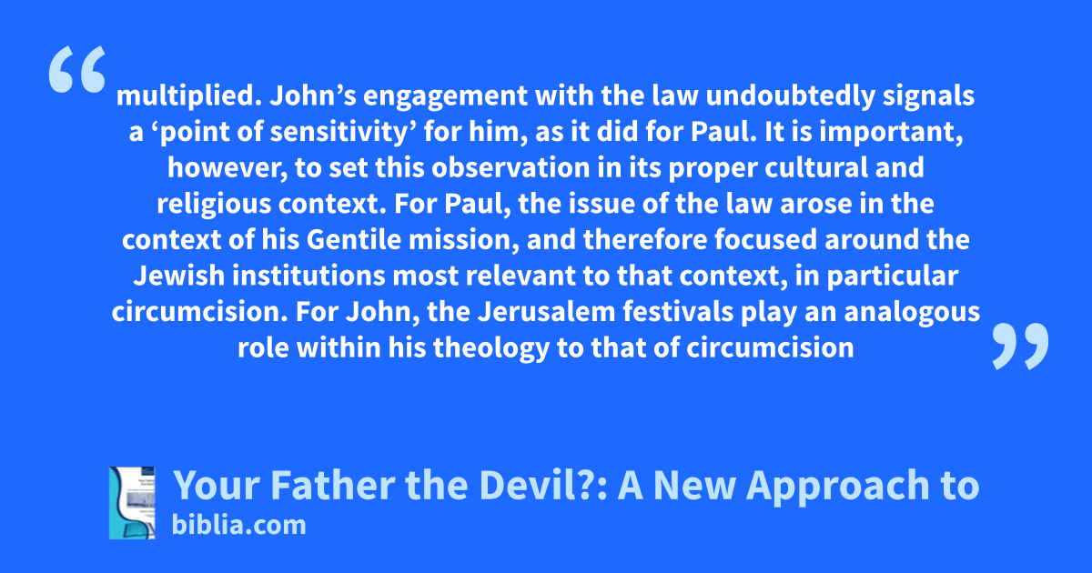 multiplied. John’s engagement with the law undoubtedly signals a ‘point of sensitivity’ for him, as it did for Paul. It is important, however, to set this observation in its proper cultural and religious context. For Paul, the issue of the law arose in the context of his Gentile mission, and therefore focused around the Jewish institutions most relevant to that context, in particular circumcision. For John, the Jerusalem festivals play an analogous role within his theology to that of circumcision