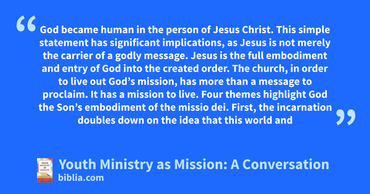God became human in the person of Jesus Christ. This simple statement has significant implications, as Jesus is not merely the carrier of a godly message. Jesus is the full embodiment and entry of God into the created order. The church, in order to live out God’s mission, has more than a message to proclaim. It has a mission to live. Four themes highlight God the Son’s embodiment of the missio dei. First, the incarnation doubles down on the idea that this world and