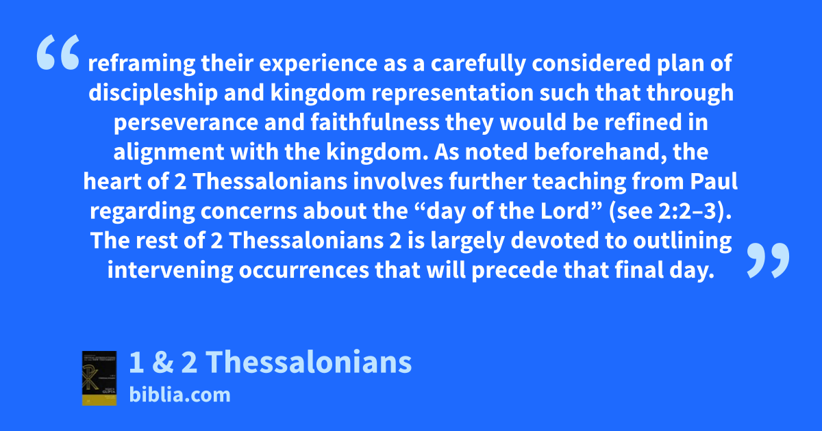 reframing their experience as a carefully considered plan of discipleship and kingdom representation such that through perseverance and faithfulness they would be refined in alignment with the kingdom. As noted beforehand, the heart of 2 Thessalonians involves further teaching from Paul regarding concerns about the “day of the Lord” (see 2:2–3). The rest of 2 Thessalonians 2 is largely devoted to outlining intervening occurrences that will precede that final day.
