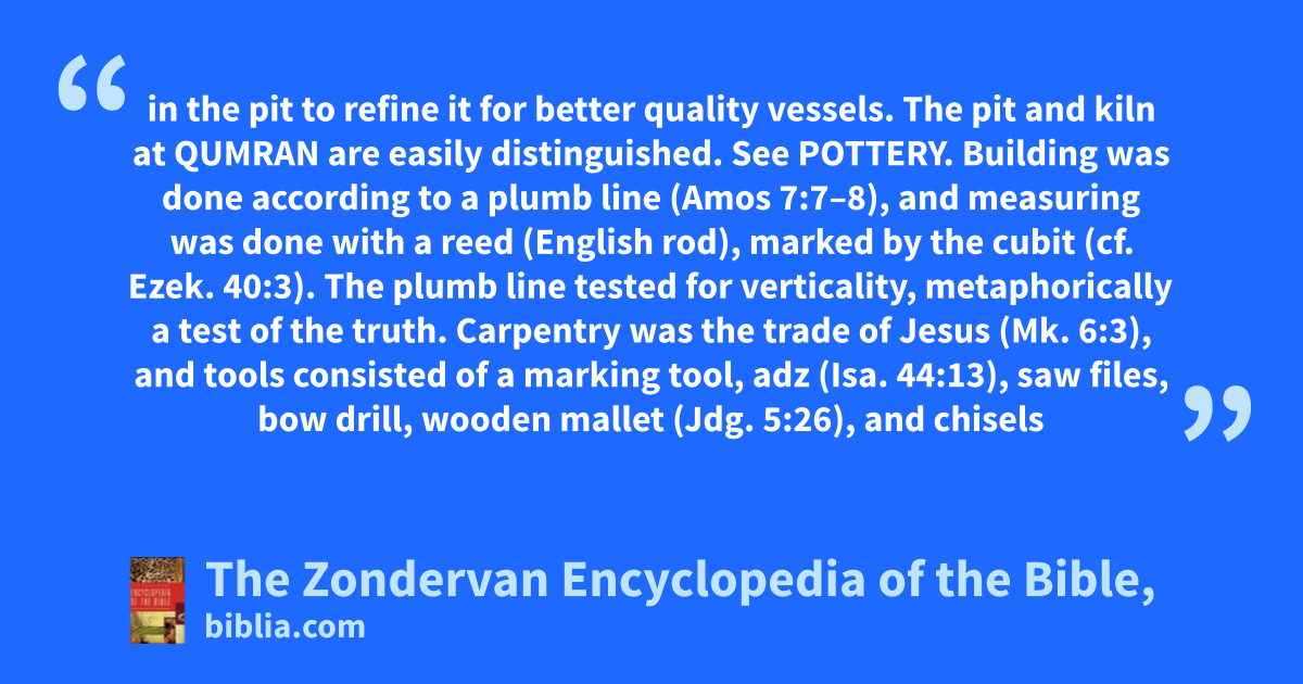 in the pit to refine it for better quality vessels. The pit and kiln at QUMRAN are easily distinguished. See POTTERY. Building was done according to a plumb line (Amos 7:7–8), and measuring was done with a reed (English rod), marked by the cubit (cf. Ezek. 40:3). The plumb line tested for verticality, metaphorically a test of the truth. Carpentry was the trade of Jesus (Mk. 6:3), and tools consisted of a marking tool, adz (Isa. 44:13), saw files, bow drill, wooden mallet (Jdg. 5:26), and chisels