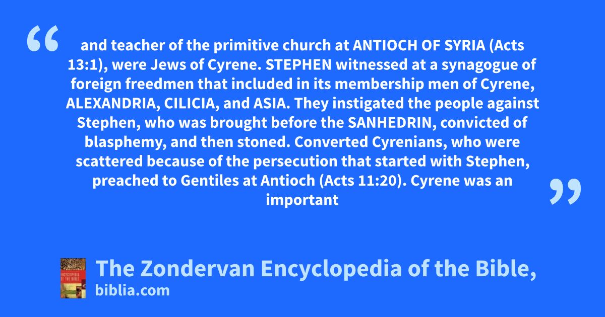 and teacher of the primitive church at ANTIOCH OF SYRIA (Acts 13:1), were Jews of Cyrene. STEPHEN witnessed at a synagogue of foreign freedmen that included in its membership men of Cyrene, ALEXANDRIA, CILICIA, and ASIA. They instigated the people against Stephen, who was brought before the SANHEDRIN, convicted of blasphemy, and then stoned. Converted Cyrenians, who were scattered because of the persecution that started with Stephen, preached to Gentiles at Antioch (Acts 11:20). Cyrene was an important