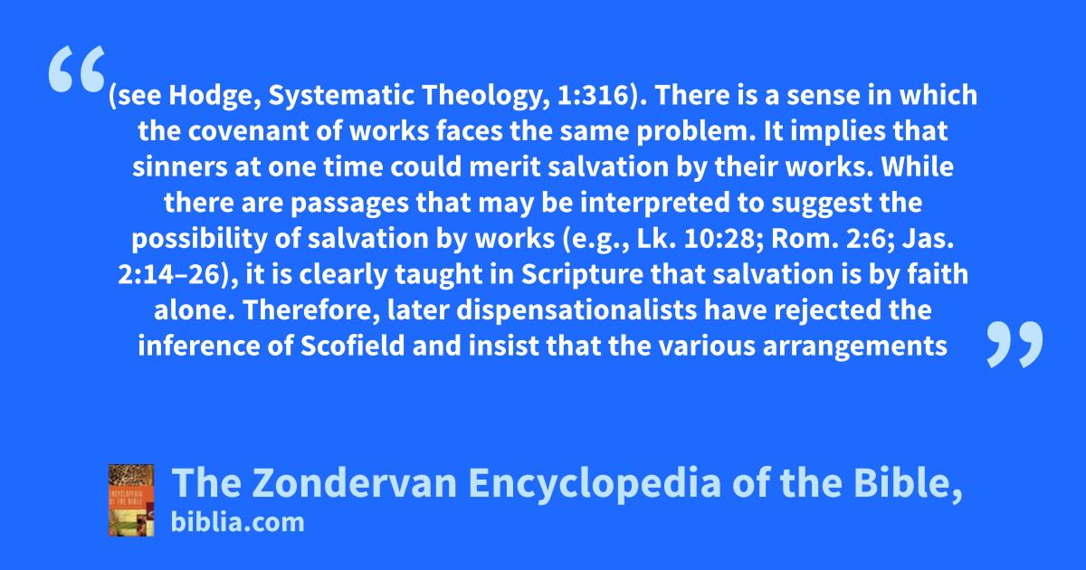 (see Hodge, Systematic Theology, 1:316). There is a sense in which the covenant of works faces the same problem. It implies that sinners at one time could merit salvation by their works. While there are passages that may be interpreted to suggest the possibility of salvation by works (e.g., Lk. 10:28; Rom. 2:6; Jas. 2:14–26), it is clearly taught in Scripture that salvation is by faith alone. Therefore, later dispensationalists have rejected the inference of Scofield and insist that the various arrangements
