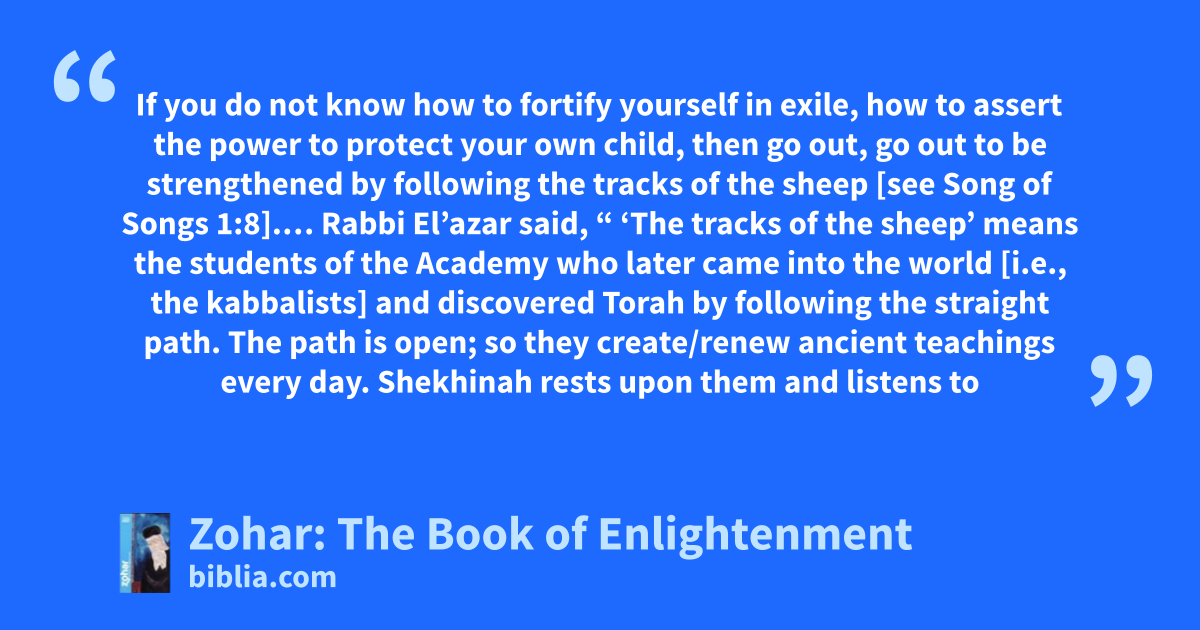 If you do not know how to fortify yourself in exile, how to assert the power to protect your own child, then go out, go out to be strengthened by following the tracks of the sheep [see Song of Songs 1:8].… Rabbi El’azar said, “ ‘The tracks of the sheep’ means the students of the Academy who later came into the world [i.e., the kabbalists] and discovered Torah by following the straight path. The path is open; so they create/renew ancient teachings every day. Shekhinah rests upon them and listens to