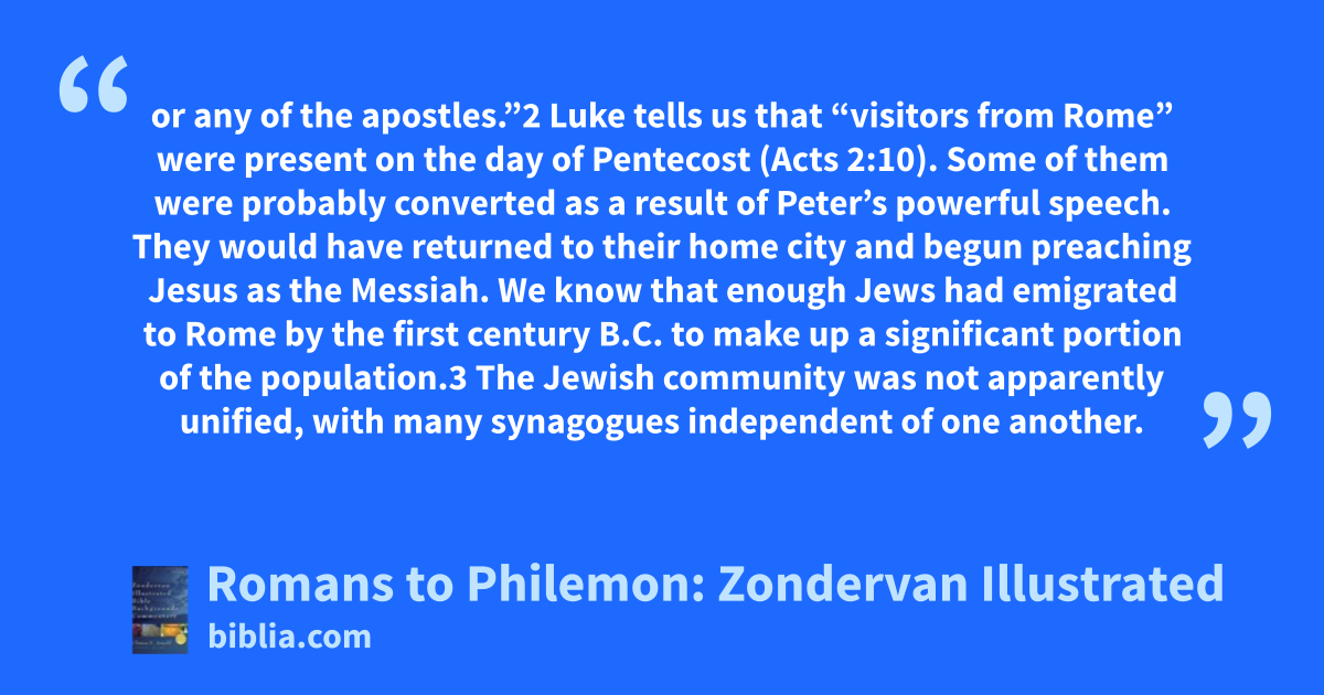 or any of the apostles.”2 Luke tells us that “visitors from Rome” were present on the day of Pentecost (Acts 2:10). Some of them were probably converted as a result of Peter’s powerful speech. They would have returned to their home city and begun preaching Jesus as the Messiah. We know that enough Jews had emigrated to Rome by the first century B.C. to make up a significant portion of the population.3 The Jewish community was not apparently unified, with many synagogues independent of one another.