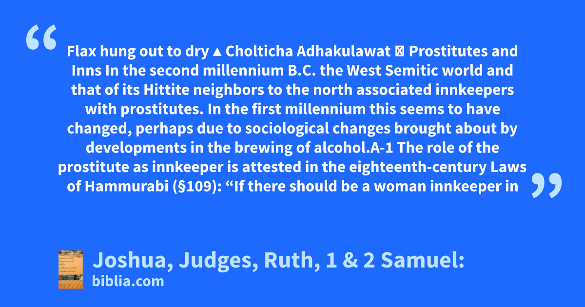 Flax hung out to dry ▲ Cholticha Adhakulawat ► Prostitutes and Inns In the second millennium B.C. the West Semitic world and that of its Hittite neighbors to the north associated innkeepers with prostitutes. In the first millennium this seems to have changed, perhaps due to sociological changes brought about by developments in the brewing of alcohol.A-1 The role of the prostitute as innkeeper is attested in the eighteenth-century Laws of Hammurabi (§109): “If there should be a woman innkeeper in