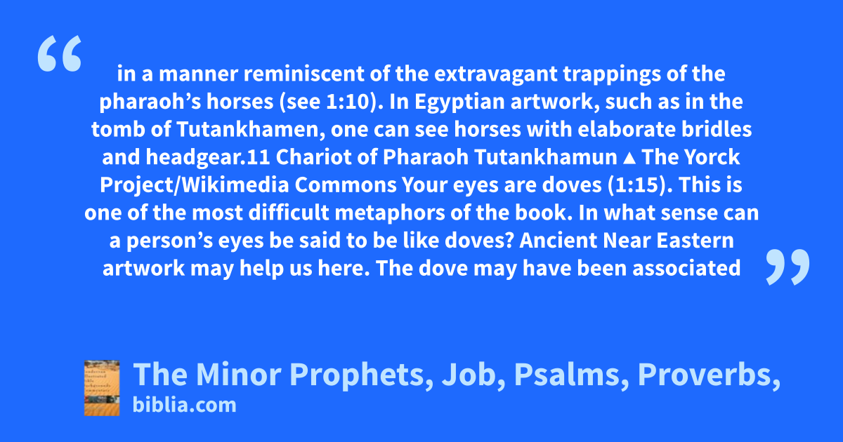 in a manner reminiscent of the extravagant trappings of the pharaoh’s horses (see 1:10). In Egyptian artwork, such as in the tomb of Tutankhamen, one can see horses with elaborate bridles and headgear.11 Chariot of Pharaoh Tutankhamun ▲ The Yorck Project/Wikimedia Commons Your eyes are doves (1:15). This is one of the most difficult metaphors of the book. In what sense can a person’s eyes be said to be like doves? Ancient Near Eastern artwork may help us here. The dove may have been associated
