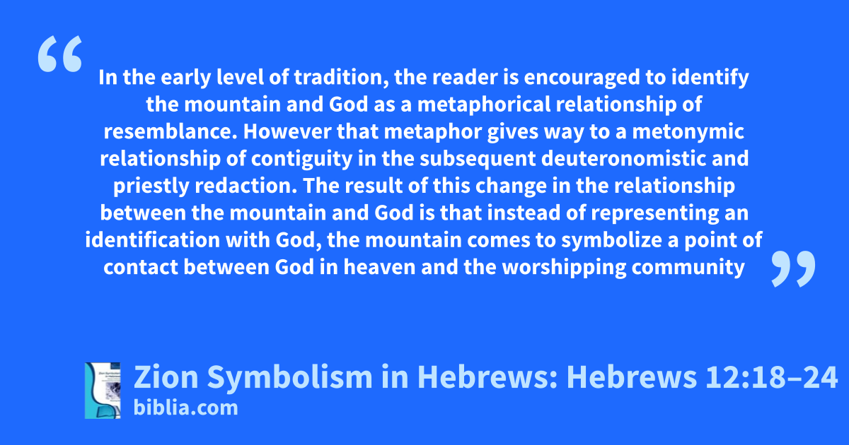 In the early level of tradition, the reader is encouraged to identify the mountain and God as a metaphorical relationship of resemblance. However that metaphor gives way to a metonymic relationship of contiguity in the subsequent deuteronomistic and priestly redaction. The result of this change in the relationship between the mountain and God is that instead of representing an identification with God, the mountain comes to symbolize a point of contact between God in heaven and the worshipping community