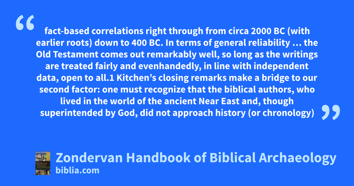 fact-based correlations right through from circa 2000 BC (with earlier roots) down to 400 BC. In terms of general reliability … the Old Testament comes out remarkably well, so long as the writings are treated fairly and evenhandedly, in line with independent data, open to all.1 Kitchen’s closing remarks make a bridge to our second factor: one must recognize that the biblical authors, who lived in the world of the ancient Near East and, though superintended by God, did not approach history (or chronology)