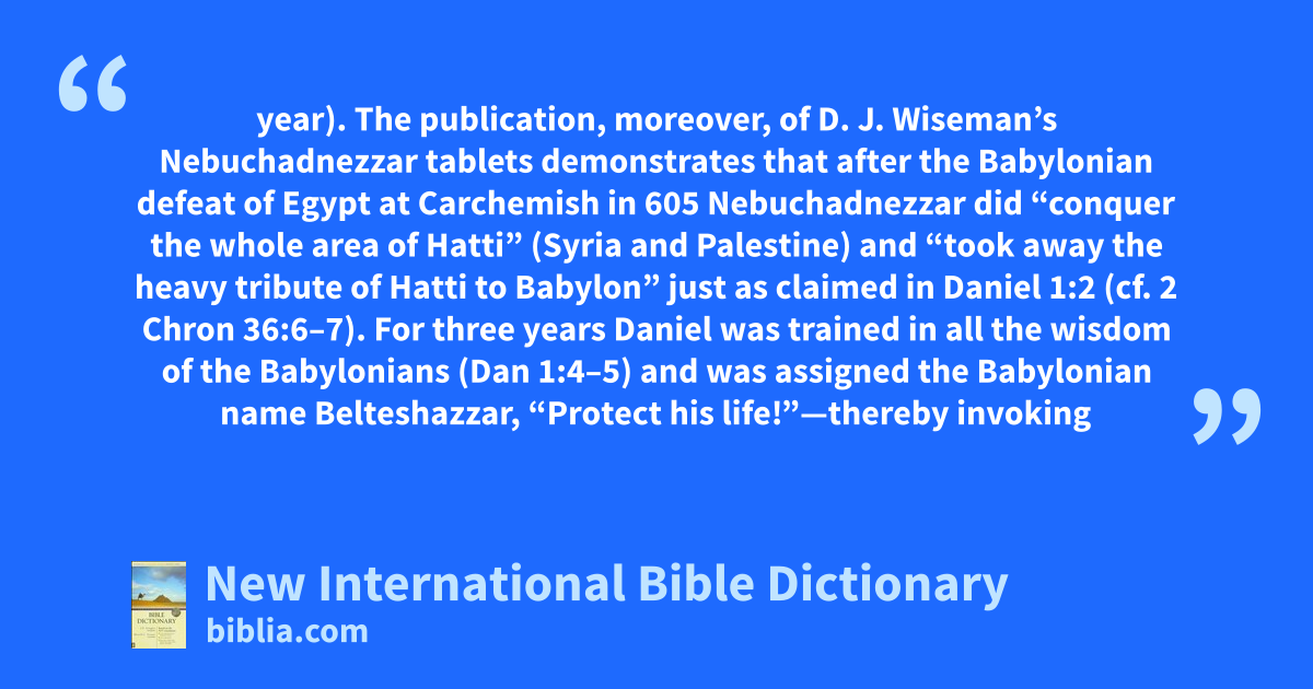 year). The publication, moreover, of D. J. Wiseman’s Nebuchadnezzar tablets demonstrates that after the Babylonian defeat of Egypt at Carchemish in 605 Nebuchadnezzar did “conquer the whole area of Hatti” (Syria and Palestine) and “took away the heavy tribute of Hatti to Babylon” just as claimed in Daniel 1:2 (cf. 2 Chron 36:6–7). For three years Daniel was trained in all the wisdom of the Babylonians (Dan 1:4–5) and was assigned the Babylonian name Belteshazzar, “Protect his life!”—thereby invoking
