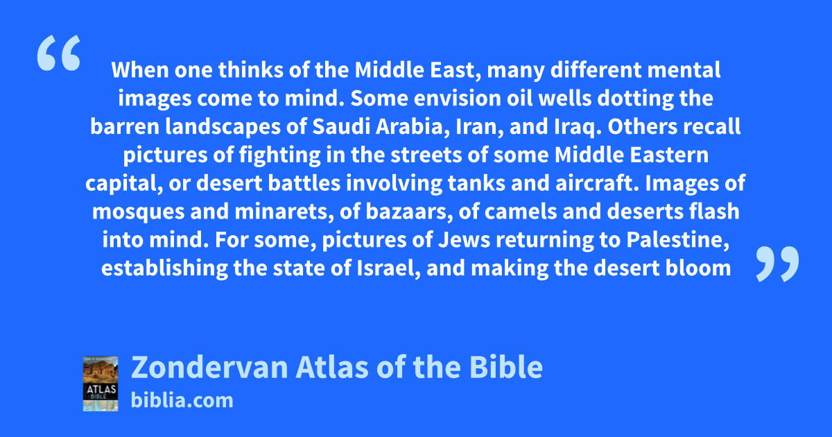 When one thinks of the Middle East, many different mental images come to mind. Some envision oil wells dotting the barren landscapes of Saudi Arabia, Iran, and Iraq. Others recall pictures of fighting in the streets of some Middle Eastern capital, or desert battles involving tanks and aircraft. Images of mosques and minarets, of bazaars, of camels and deserts flash into mind. For some, pictures of Jews returning to Palestine, establishing the state of Israel, and making the desert bloom