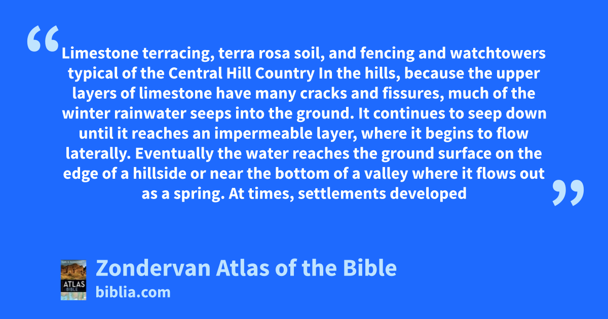 Limestone terracing, terra rosa soil, and fencing and watchtowers typical of the Central Hill Country In the hills, because the upper layers of limestone have many cracks and fissures, much of the winter rainwater seeps into the ground. It continues to seep down until it reaches an impermeable layer, where it begins to flow laterally. Eventually the water reaches the ground surface on the edge of a hillside or near the bottom of a valley where it flows out as a spring. At times, settlements developed