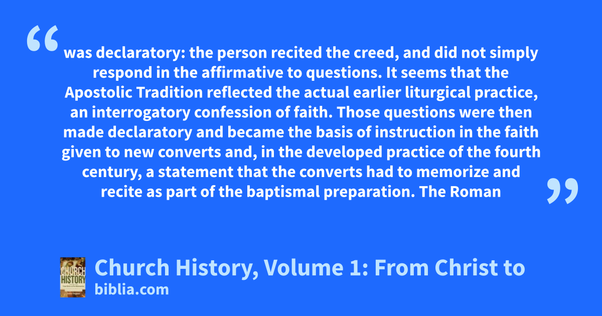 was declaratory: the person recited the creed, and did not simply respond in the affirmative to questions. It seems that the Apostolic Tradition reflected the actual earlier liturgical practice, an interrogatory confession of faith. Those questions were then made declaratory and became the basis of instruction in the faith given to new converts and, in the developed practice of the fourth century, a statement that the converts had to memorize and recite as part of the baptismal preparation. The Roman