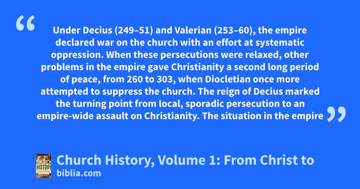 Under Decius (249–51) and Valerian (253–60), the empire declared war on the church with an effort at systematic oppression. When these persecutions were relaxed, other problems in the empire gave Christianity a second long period of peace, from 260 to 303, when Diocletian once more attempted to suppress the church. The reign of Decius marked the turning point from local, sporadic persecution to an empire-wide assault on Christianity. The situation in the empire