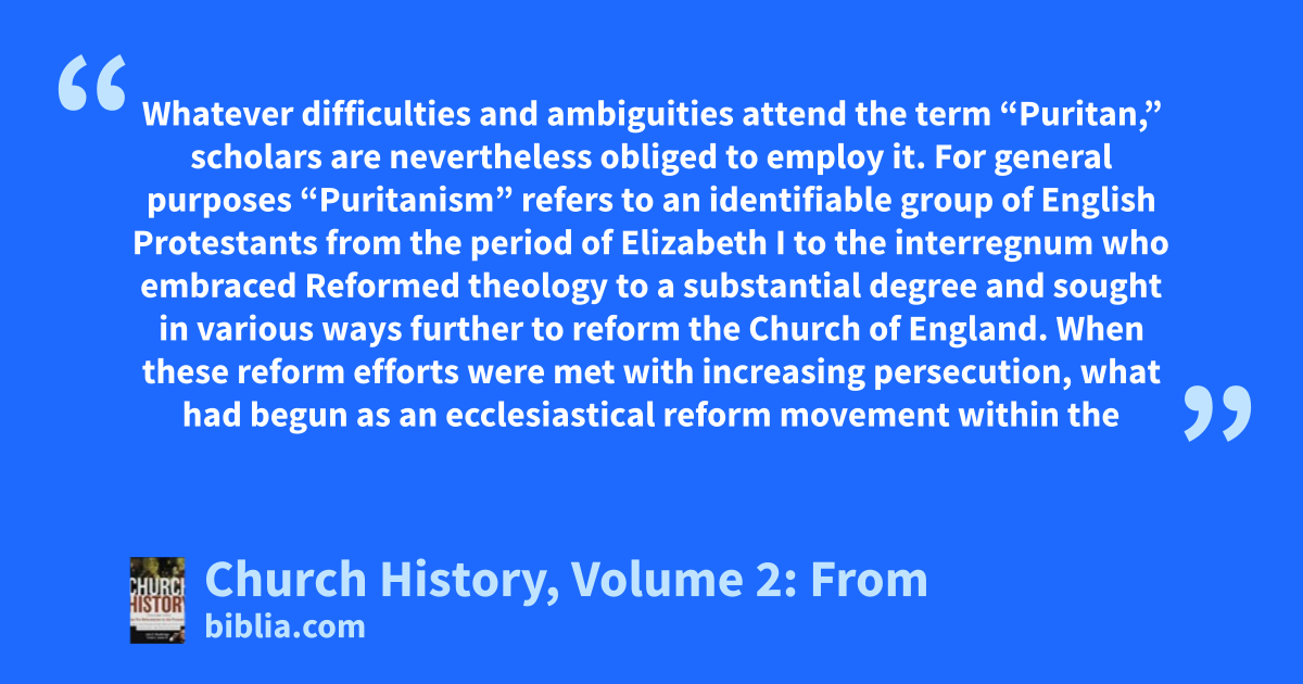 Whatever difficulties and ambiguities attend the term “Puritan,” scholars are nevertheless obliged to employ it. For general purposes “Puritanism” refers to an identifiable group of English Protestants from the period of Elizabeth I to the interregnum who embraced Reformed theology to a substantial degree and sought in various ways further to reform the Church of England. When these reform efforts were met with increasing persecution, what had begun as an ecclesiastical reform movement within the