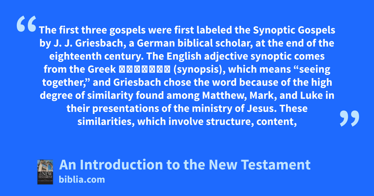 The first three gospels were first labeled the Synoptic Gospels by J. J. Griesbach, a German biblical scholar, at the end of the eighteenth century. The English adjective synoptic comes from the Greek συνόψις (synopsis), which means “seeing together,” and Griesbach chose the word because of the high degree of similarity found among Matthew, Mark, and Luke in their presentations of the ministry of Jesus. These similarities, which involve structure, content,