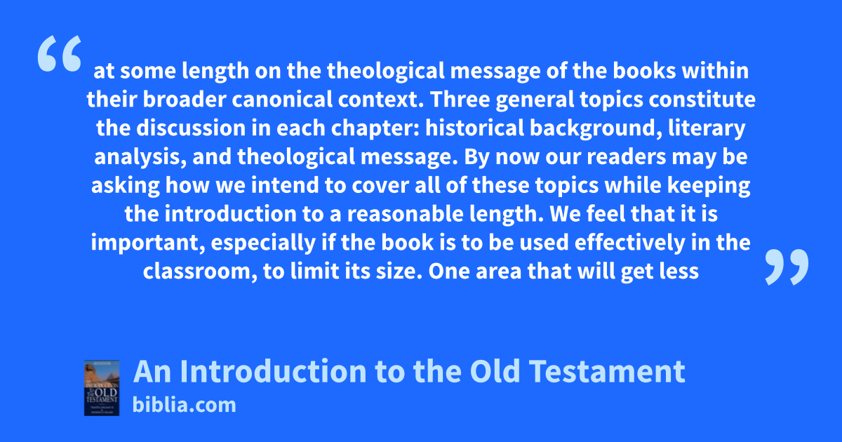 at some length on the theological message of the books within their broader canonical context. Three general topics constitute the discussion in each chapter: historical background, literary analysis, and theological message. By now our readers may be asking how we intend to cover all of these topics while keeping the introduction to a reasonable length. We feel that it is important, especially if the book is to be used effectively in the classroom, to limit its size. One area that will get less