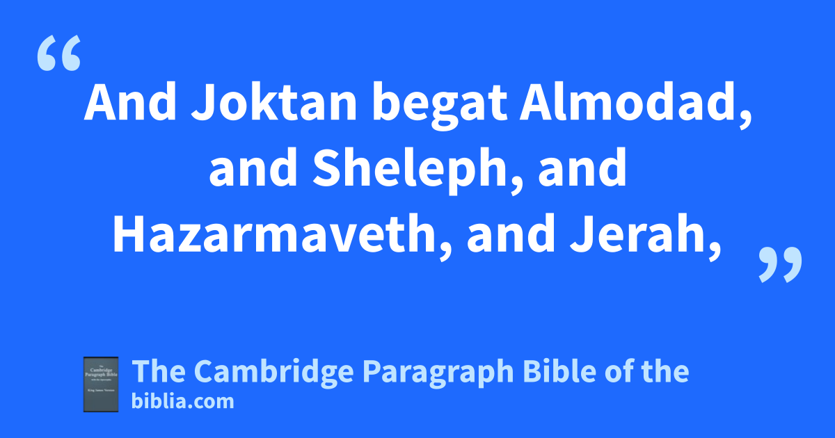 17 gThe sons of Shem; Elam, and Asshur, and Arphaxad, and Lud, and Aram, hand Uz, and Hul, and Gether, and * Meshech. 18 And Arphaxad begat iShelah, and Shelah begat Eber. 19 And unto Eber were born two sons: the name of the one was * Peleg; because in his days the earth was divided: and his brother’s name was Joktan. 20 And Joktan begat Almodad, and Sheleph, and Hazarmaveth, and Jerah, 21 Hadoram also, and Uzal, and Diklah, 22 and jEbal, and Abimael, and Sheba, 23 and Ophir, and Havilah, and Jobab. All these were the sons of Joktan.