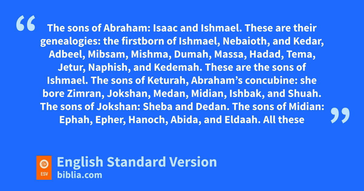 28 The sons of Abraham: iIsaac and jIshmael. 29 kThese are their genealogies: the firstborn of Ishmael, Nebaioth, and Kedar, Adbeel, Mibsam, 30 Mishma, Dumah, Massa, Hadad, Tema, 31 Jetur, Naphish, and Kedemah. These are the sons of Ishmael. 32 lThe sons of Keturah, Abraham’s concubine: she bore Zimran, Jokshan, Medan, Midian, Ishbak, and Shuah. The sons of Jokshan: Sheba and Dedan. 33 The sons of Midian: Ephah, Epher, Hanoch, Abida, and Eldaah. All these were the descendants of Keturah.
