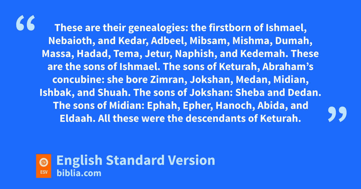 28 The sons of Abraham: iIsaac and jIshmael. 29 kThese are their genealogies: the firstborn of Ishmael, Nebaioth, and Kedar, Adbeel, Mibsam, 30 Mishma, Dumah, Massa, Hadad, Tema, 31 Jetur, Naphish, and Kedemah. These are the sons of Ishmael. 32 lThe sons of Keturah, Abraham’s concubine: she bore Zimran, Jokshan, Medan, Midian, Ishbak, and Shuah. The sons of Jokshan: Sheba and Dedan. 33 The sons of Midian: Ephah, Epher, Hanoch, Abida, and Eldaah. All these were the descendants of Keturah.