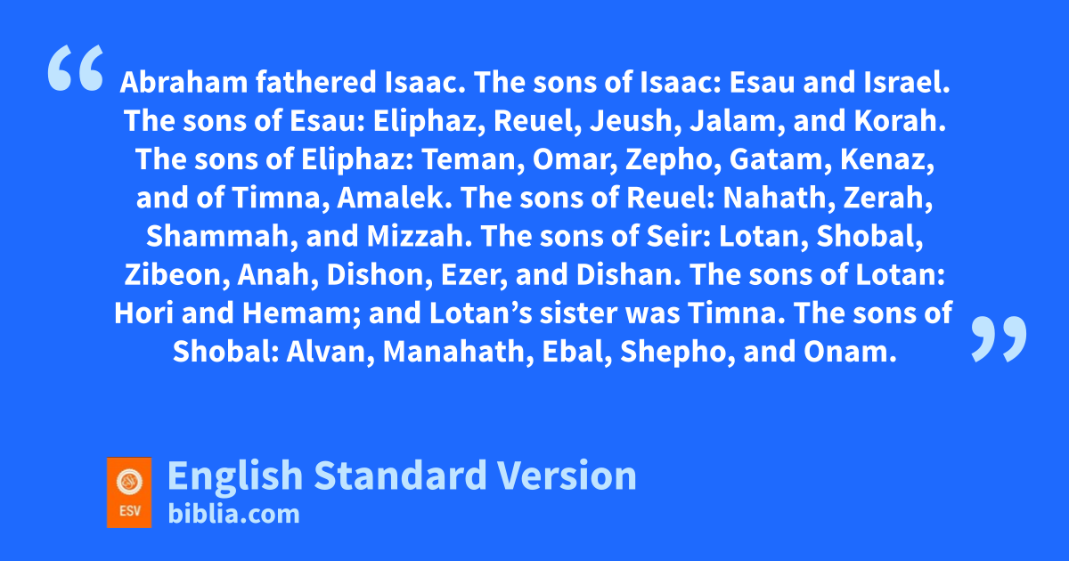 34 Abraham fathered iIsaac. The sons of Isaac: mEsau and nIsrael. 35 oThe sons of Esau: Eliphaz, Reuel, Jeush, Jalam, and Korah. 36 The sons of Eliphaz: Teman, Omar, Zepho, Gatam, Kenaz, and of Timna,7 Amalek. 37 The sons of Reuel: Nahath, Zerah, Shammah, and Mizzah.