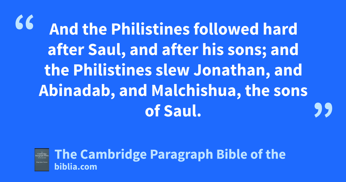 X. * Now athe Philistines fought against Israel; and the men of Israel fled from before the Philistines, and fell down * slain in mount Gilboa. 2 And the Philistines followed hard after Saul, and after his sons; and the Philistines slew Jonathan, and * Abinadab, and Malchishua, the sons of Saul. 3 And the battle went sore against Saul, and the * archers * hit him, and he was wounded of the archers. 4 Then said Saul to his armourbearer, Draw thy sword, and thrust me through therewith; lest these uncircumcised come and * abuse me. But his armourbearer would not; for he was sore afraid. So Saul took a sword, and fell upon it. 5 And when his armourbearer saw that Saul was dead, he fell likewise on the sword, and died. 6 So Saul died, and his three sons, and all bhis house died together.